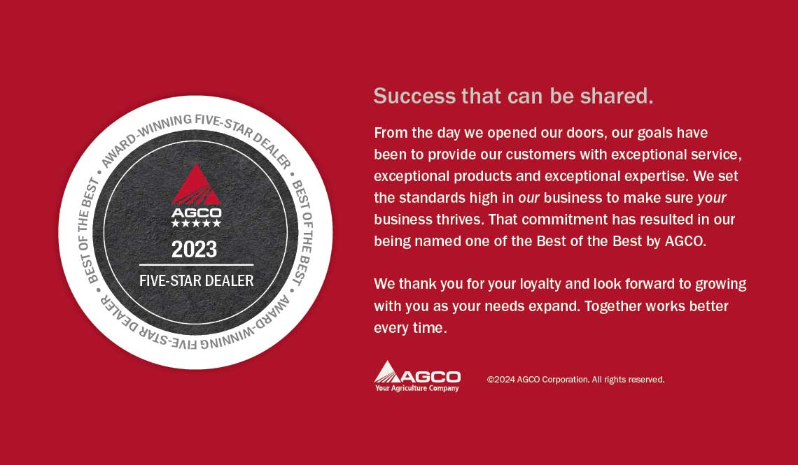 Our longevity can be traced to our original vision: To carry inventory that features only the best agricultural equipment lines in the world and to provide unparalleled service to back them up.