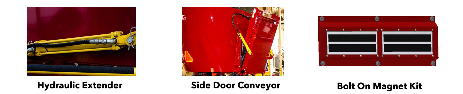 Side Door Conveyor: For single auger units; 21” Fixed & 36, 44, 72 ad 96 inch hydraulic fold up conveyors are available for heightened discharge.