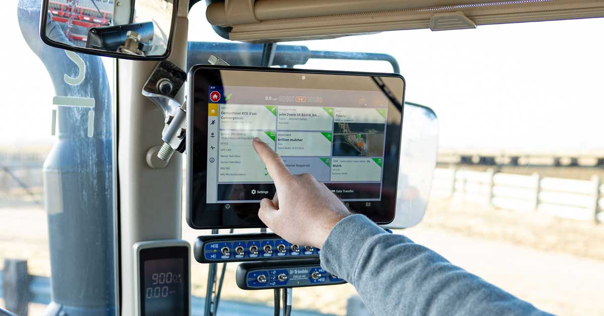 Try It on Your Farm — Demo or Trial AvailableClose-up of Trimble GFX display running CenterPoint RTX guidance system for precise field operations on a modern farm tractor